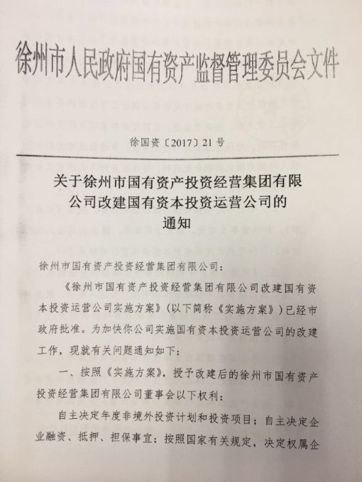 二、1月24日,市國資委印發(fā)《關(guān)于徐州市國有資產(chǎn)投資經(jīng)營集團(tuán)有限公司改建國有資本投資運(yùn)營公司的通知》,集團(tuán)公司被確定為徐州首家國有資本投資運(yùn)營公司試點(diǎn)企業(yè)。